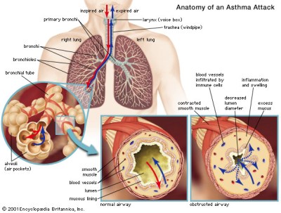 There are several things happening in the lowers airways during an asthma attack. There is constriction of the airway as well as inflammation and increased mucous production. It’s easier for air to get in than to get out.
