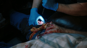 Later in the episode, a picture of the wound is shown with a “live” shell in the anterior thigh. The fact that it is a live shell is made by a firefighter who is former military based on the color. I can’t comment on whether or not that’s true— I’m not military— but the team does make a decent choice (since the patient is stable) to not take him inside the hospital.