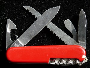 I am writing a story inspired by the Saw franchise in which a man is forced to stab himself with three Swiss army knives. The knives will remain in. For the best chance of survival, should all the stabs be in the lower abdomen, or also bladder and/or hands/forearms?