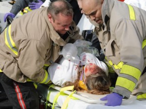 SCENARIO: Serious MVC involving two cars and multiple victims. All passengers were wearing seatbelts, and airbags deployed, but the crash was serious enough that victims are still severely injured.